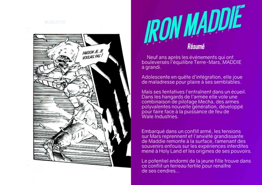 Iron Maddie est un projet parallèle au récit d'IRON JACK. Résumé Neuf ans après les événements qui ont bouleversés l'équilibre Terre-Mars, MADDIEà grandi.Adolescente en quête d'intégration, elle joue de maladresse pour plaire à ses semblabl