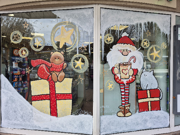 C’est l’heure pour les commerces de se parer de leurs plus beaux habits de fête ! À Limoges, la Pharmacie du Roussillon fait de nouveau appel à Laure pour une fresque de Noël, pleine d’humour : Père Noël rigolo, gros chat et ourson avec une grande écharpe… C’est doux, fun, et moi j’adore ! 🐻🎅