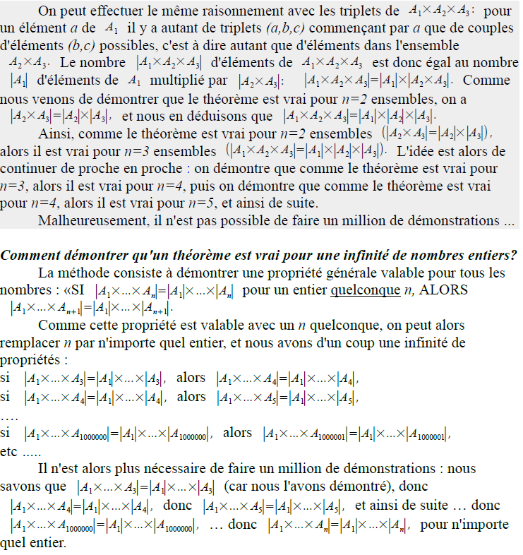 Le théorème suivant est vrai pour tous les nombres entiers positifs. On peut le prouver dans le cas où n=1, dans le cas où n=2, dans le cas où n=3, mais on ne peut pas continuer comme ça jusqu'à l'infini ...