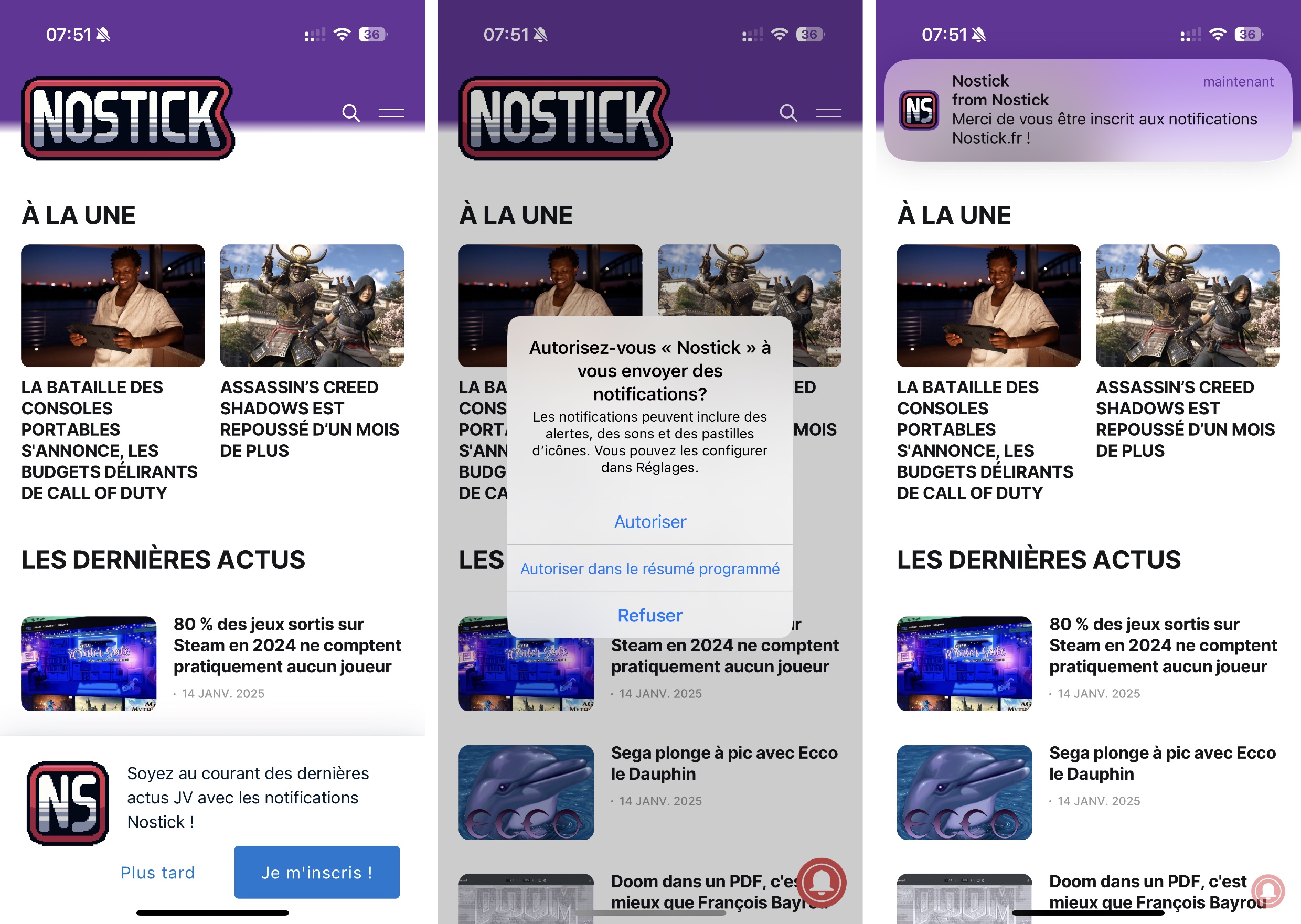 Et c'est tout. Vous recevrez ensuite une notification de Nostick à chaque fois qu'un nouvel article est posté. Il suffira de cliquer dessus ou de la toucher pour lire l'actu en question dans le navigateur ou la web app. Et bien sûr, à tout moment vous pouvez vous désabonner des notifications, soit en cliquant sur la cloche rouge, soit dans les réglages Notifications de votre appareil.