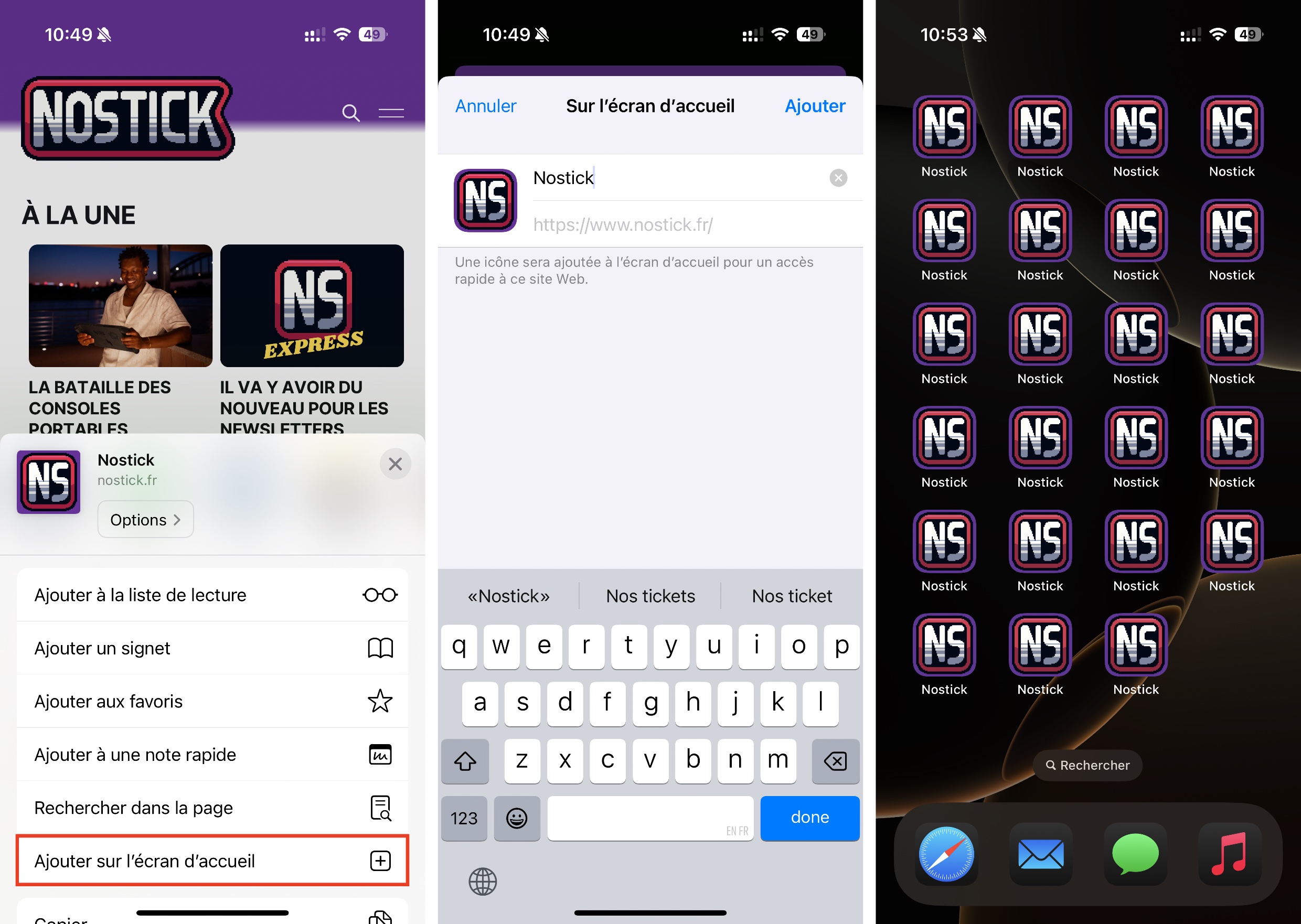 Sur iOS, il faut au préalable installer la web app sur l'écran d'accueil de l'iPhone ou de l'iPad (une seule fois, c'est suffisant 😁). Touchez le bouton de partage en bas, puis l'option « Ajouter sur l'écran d'accueil » :
