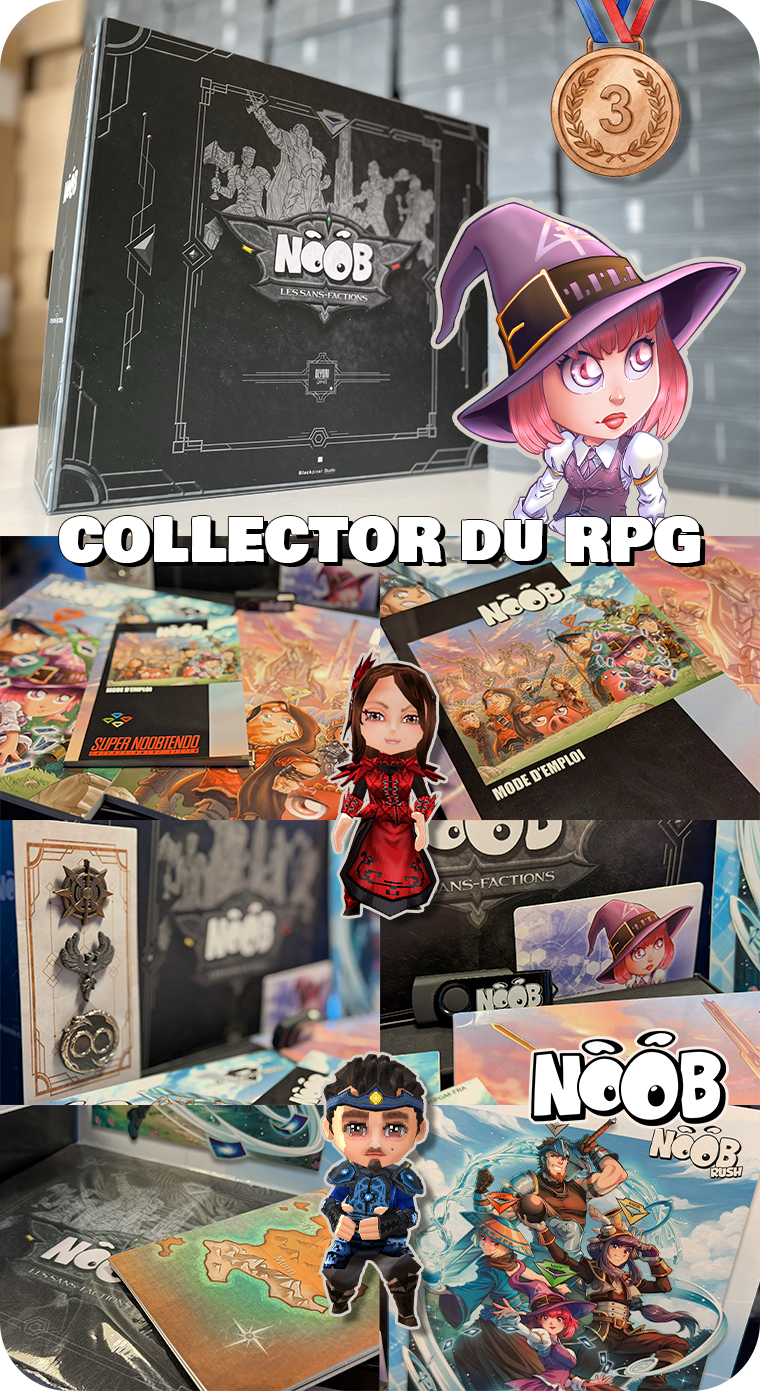 3/ Coffret collector ultime à tirage unique comportant la clé Steam du jeu vidéo Noob + la notice façon Super Nintendo + le guide officiel façon Super Nintendo + l'artbook du RPG + une clé usb remplie de bonus + les insignes en métal de l'Ordre, de l'Empire et de la Coalition + un tapis de souris + la carte du monde + divers bonus.
