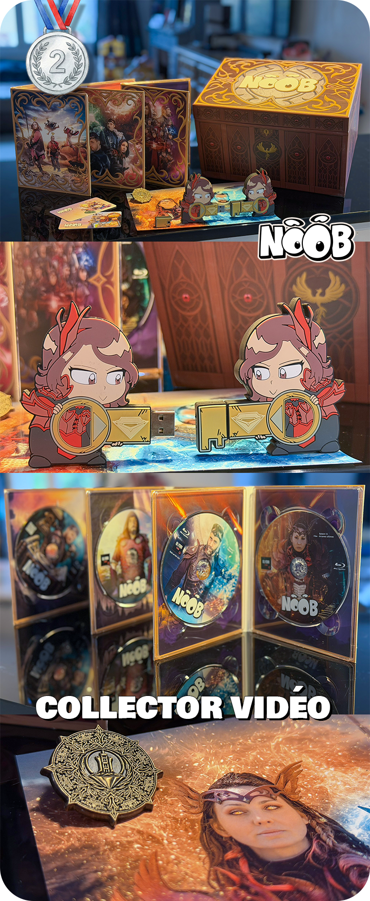 2/ Coffret collector ultime à tirage unique comportant l'intégrale de Noob saisons 1 à 11 + le film Noob : Les arcanes ultimes + 39h de musiques via 550 thèmes + la clé USB Gaea + insigne en métal Gagnetorith + divers bonus.