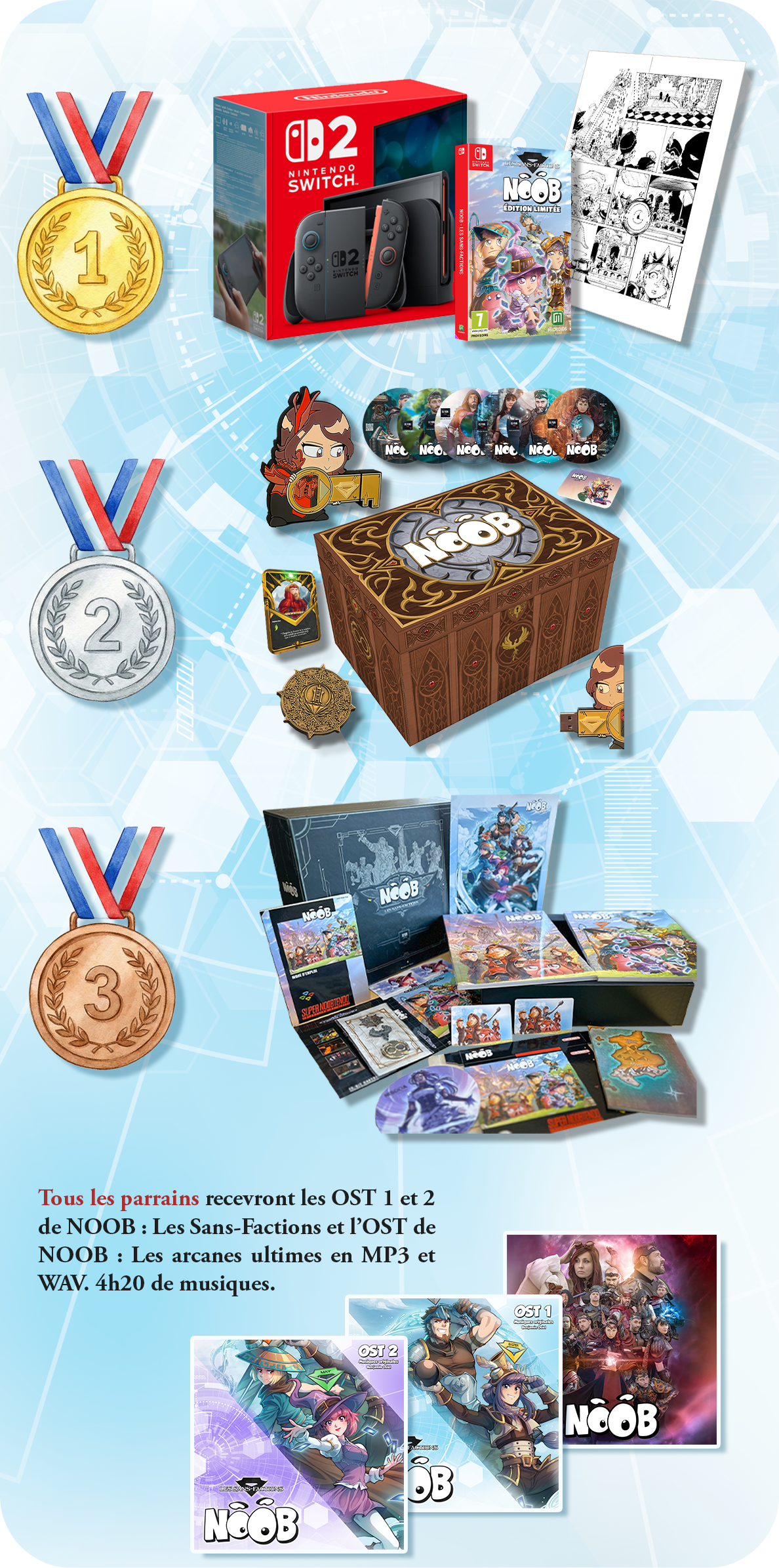 Tous/ Tous les parrains recevront les OST 1 et 2 de NOOB : Les Sans-Factions et l’OST de NOOB : Les arcanes ultimes en MP3 et WAV. 4h20 de musiques pour lire nos ouvrages avec une immersion totale.