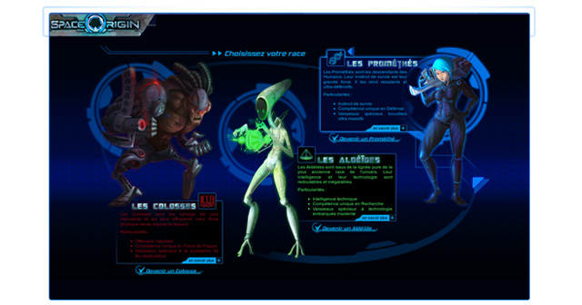 Prenez le temps de lire toutes les descriptions ! Laissez-vous prendre par cet Univers et découvrez les planètes, les histoires de chaque Cyborg et celle de l'Univers de SpaceOrigin ! La naissance de chacune des trois races est décrite sur le mode de nouvelles de SF. Vous découvrirez les relations complexes qui unissent et divisent les individus qui peuplent le jeu !