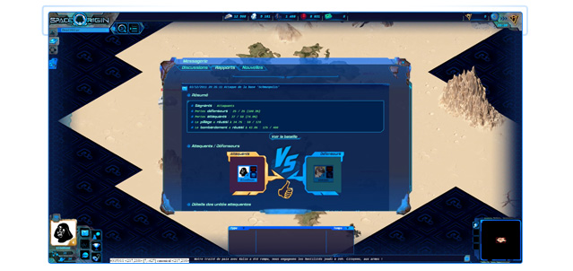 Si les combats, dans la plupart des MMORTS, se contentent d'être signifiés par d'austères rapports de combats à lire sans avoir vécu ce moment intense, ceux de SpaceOrigin se déroulent sous vos yeux, avec les formations que vous aurez vous-même planifiées ! Et vous aurez le choix de voir deux déroulements dynamiques du combat ! L'un sera immersif, l'autre détaillé au tour par tour, de sorte que vous puissiez affiner votre stratégie et vos formations de combat.