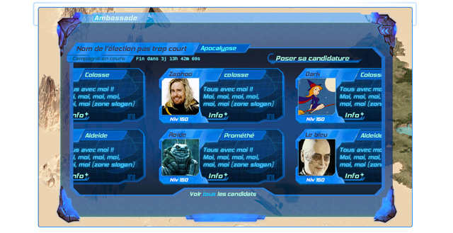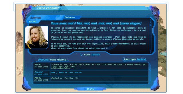 Imaginez-vous diriger et imposer vos lois ! Imaginez-vous porter sur vos solides épaules une planète entière de centaines de joueurs qui auront voté pour vous ! Imaginez-vous les accabler de taxes pour vous enrichir ou décider de missions interplanétaires assurant la survie de ceux qui vous auront élu ! De nombreuses possibilités s'offrent à vos ambitions ! Vous pourrez être craint, aimé, haï ou envié !