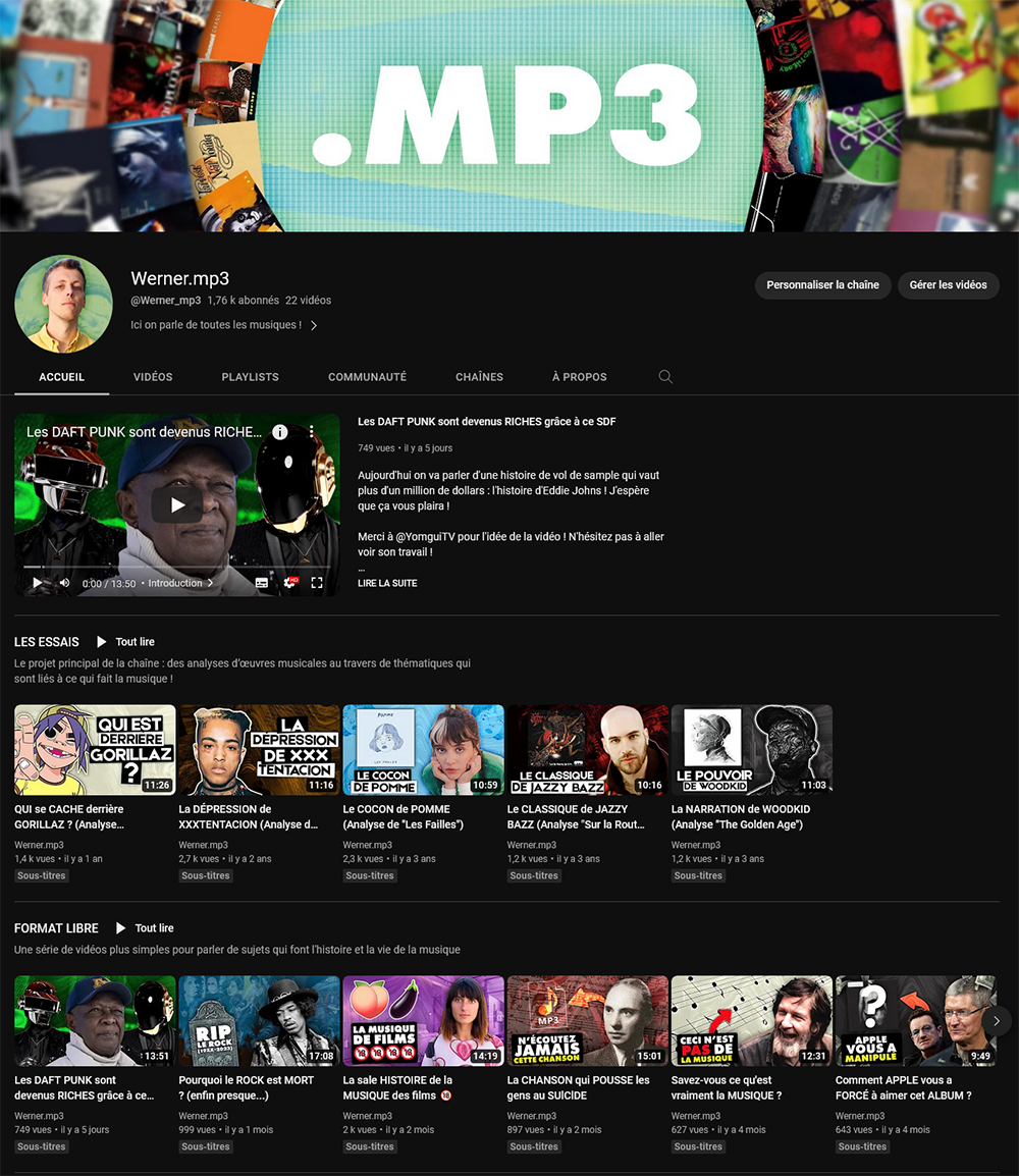 Moi c'est Werner (oui c'est mon prénom), j'ai 24 ans et suis vidéaste pro depuis 2 ans (je travaille pour des entreprises, d'autres YouTubers etc.). Il y a 4 ans, j'ai lancé ma chaine Youtube sur laquelle je parle de musique : Werner.MP3 !