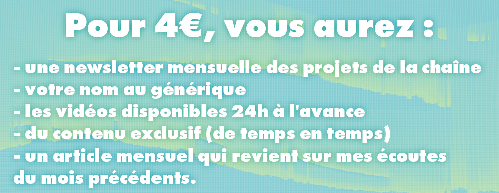Merci d'avoir lu ces quelques lignes et encore plus, si vous décidez de soutenir mon travail. J'espère que la suite la chaîne vous plaira, et je vous remercie pour votre soutien qu'il soit financier ou non !!